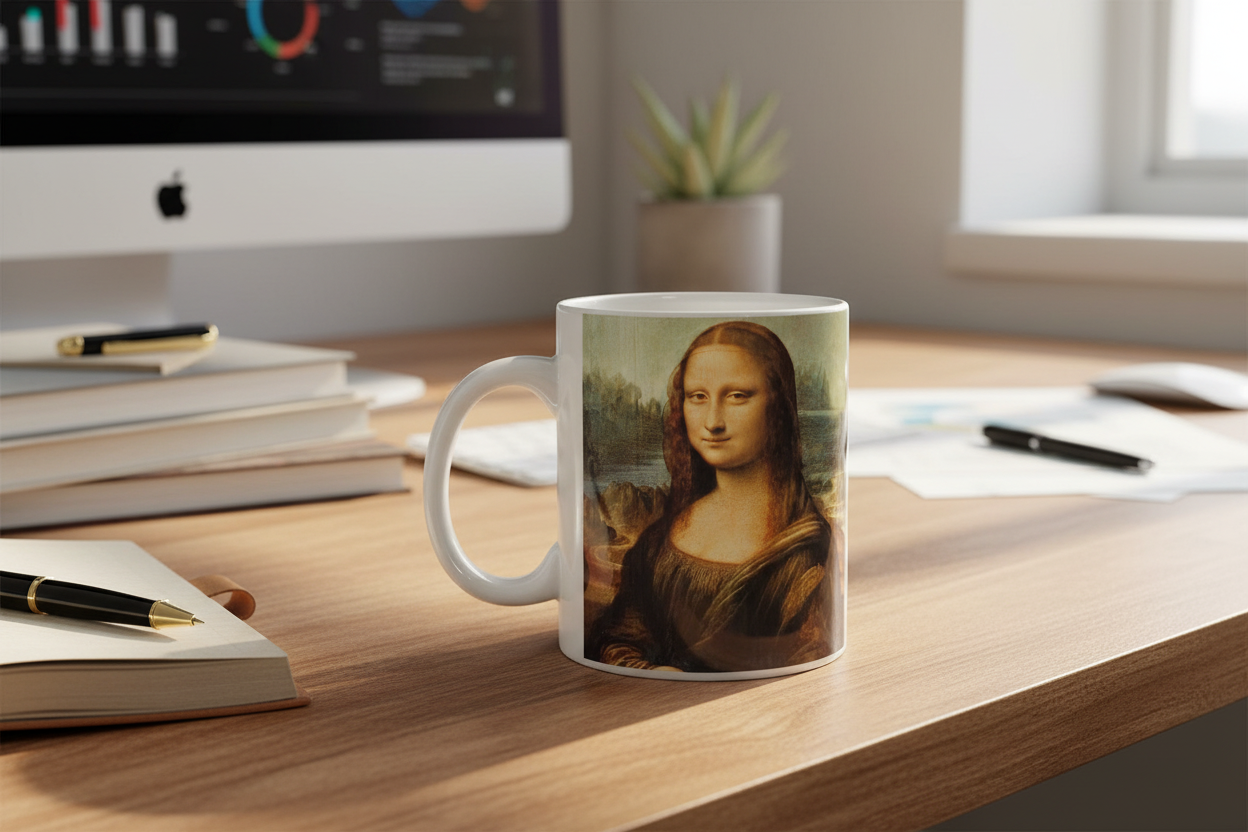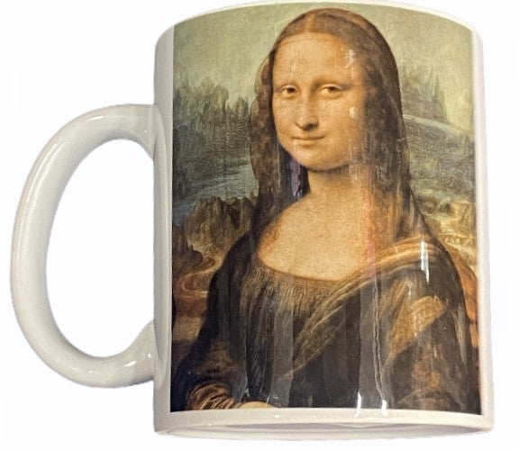 Magnífica caneca da Mona Lisa, pintura de Leonardo da Vinci, exibida no Museu do Louvre em Paris
