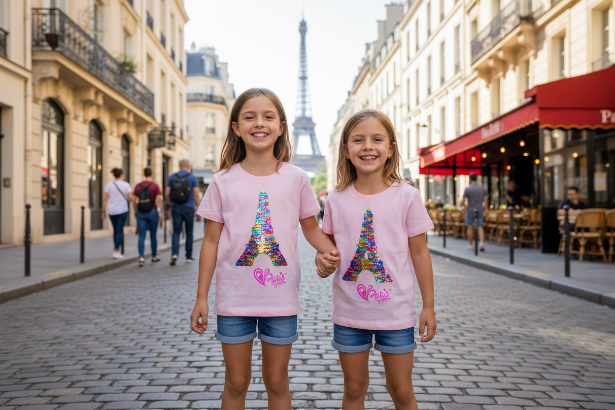 Linda T-shirt cor de rosa para menina com uma Torre Eiffel em lantejoulas reversíveis