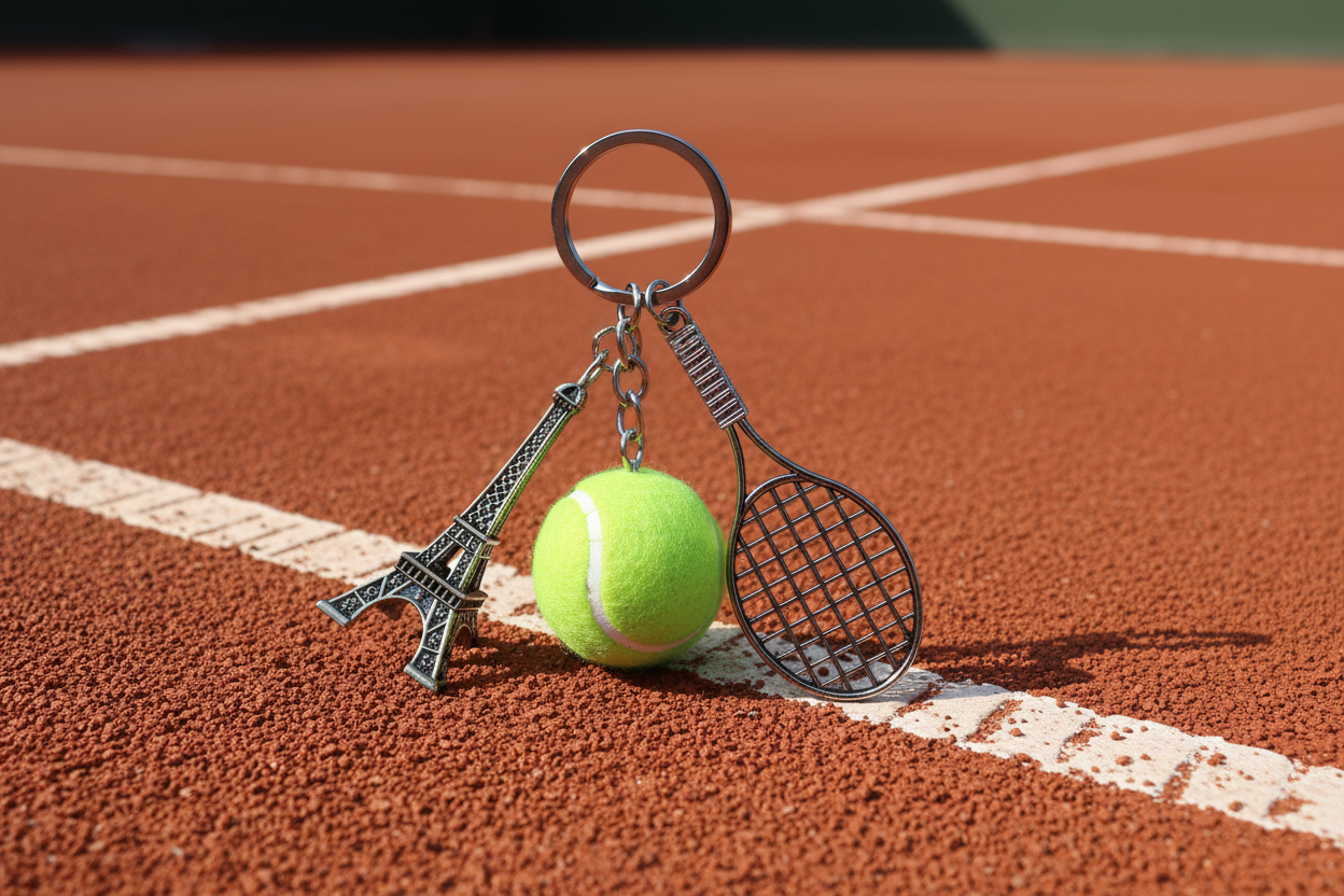 🗼 Design cativante: Chaveiro representando a famosa Torre Eiffel, acompanhado de uma pequena raquete de tênis  e uma bola de tênis, capturando o espírito esportivo e parisiense.